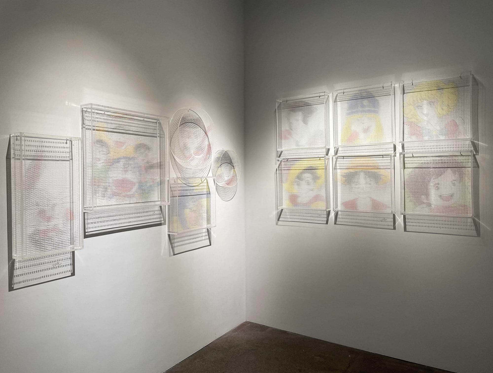 由上述系列延伸的作品〈紅色吊帶裙〉,每一個小女孩擁有相似造型—西瓜皮髮型與吊帶裙,唯獨不同的是,透過紅線的編織,她們穿戴起不同動畫角色的特徵,從米奇、原子小金剛、北海小英雄、多啦a夢,如角色扮演般,女孩搖身成為眾人都曾想成為的偶像,希望擁有相同的性格或超能力,透過作品,疊合著大家過往的記憶,實踐了兒時天馬行空的想像。