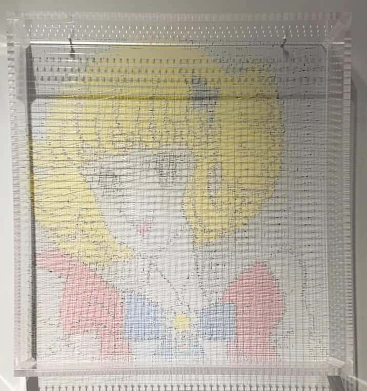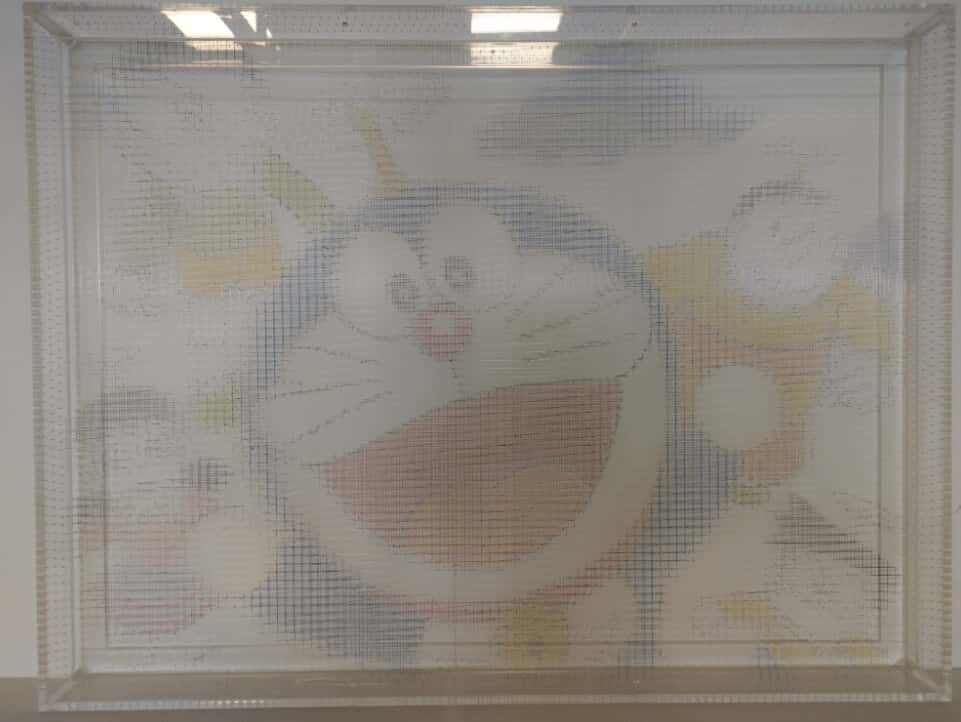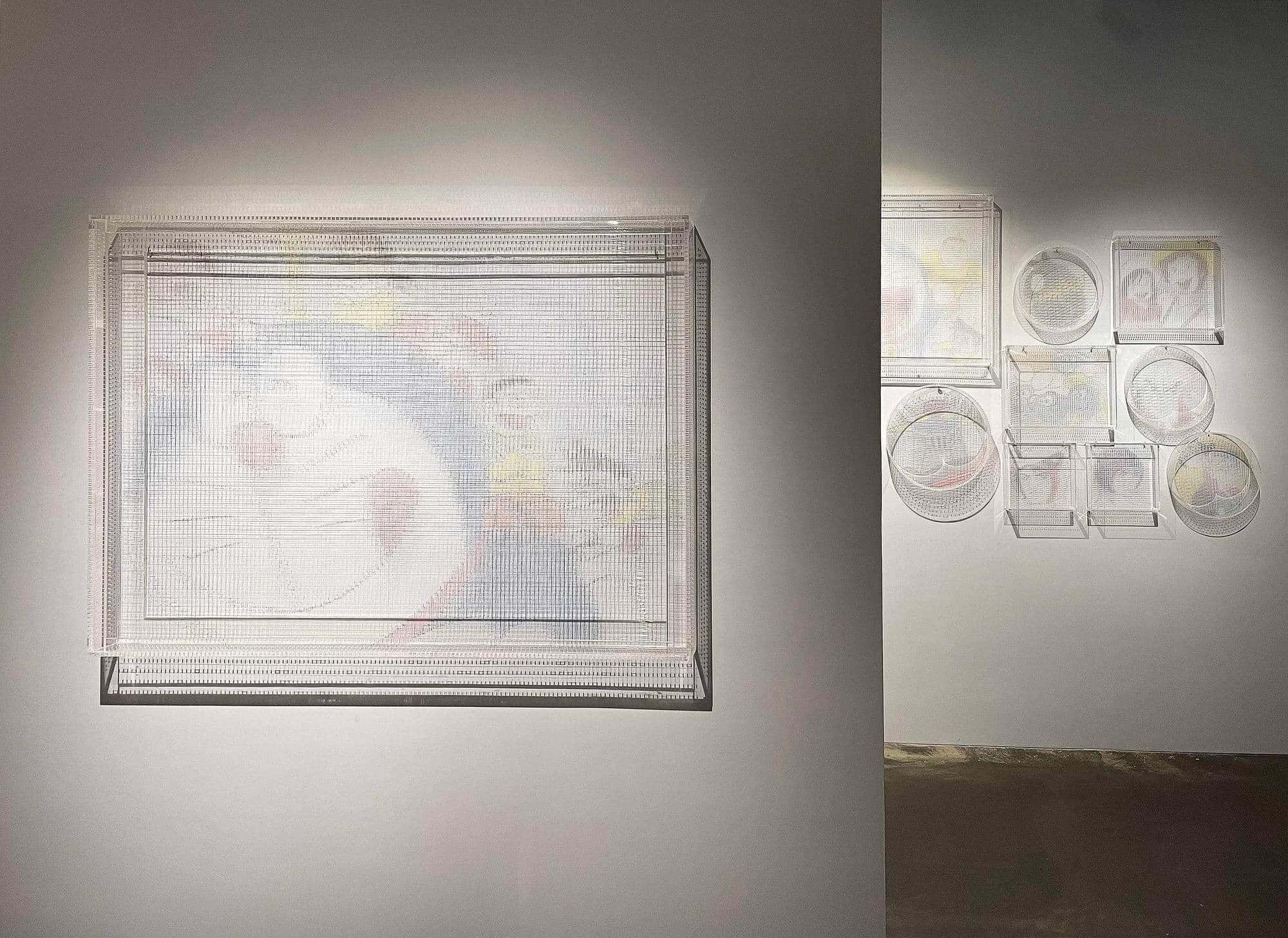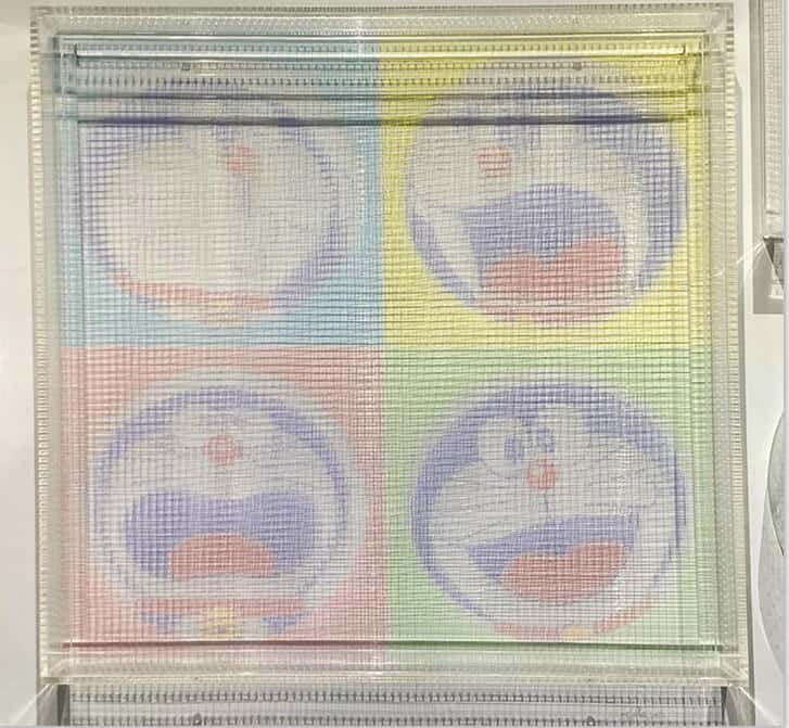 廖敏君作品-〈我們的曾經-80 普普小叮噹〉,透明壓克力、 透明 1.75 碳纖維線、透明免燒玻璃顏料,90 x 90 x 9.5 cm。圖 / 多納藝術提供。