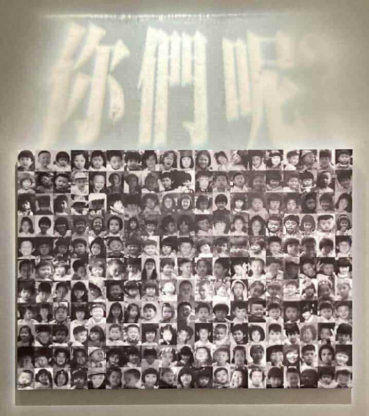 本展唯一一件的裝置作品〈曖曖-他們呢?〉,曾獲109年全國美展綜合材料類銅牌獎,畫面中將一百多位孩童的照片像素化,去除特定人物的指涉,在牆上投影的「你們呢?」三字,就像是在試圖勾起觀者與影像之間的對話關係。藉著多位人像攝集結的眾生相,意旨世間各種人的表現和面貌,在觀看過程中尋找屬於自己的影子,同時紀錄下眾人的集體意識。