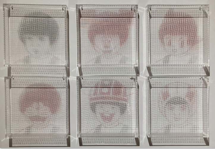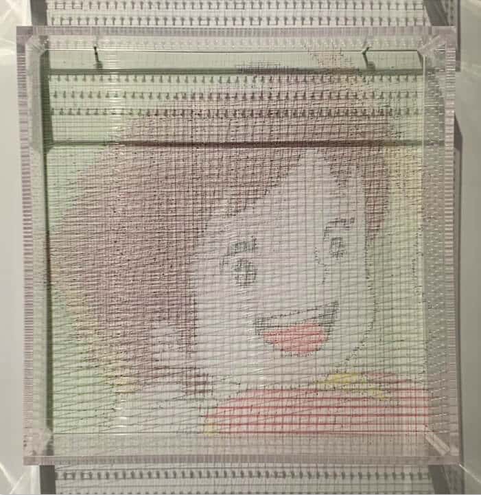 在圖像的呈現上,作品平均每件都將編織8至10層。當線條疊加的層次越多,底下草圖被遮擋的面積也就跟著增長,因此當畫面停留在第三層時,多半借助的是藝術家腦海中對影像的記憶。對廖敏君而言,編織的過程就像是雕刻中減法的概念,越到上層,圖像細節的處理也就跟著銳減,甚至只需在部分線條上以顏色點綴,使影像呈現更為完整;換言之,圖像成形的與否取決於編織初始,對形(Shape)的定位。