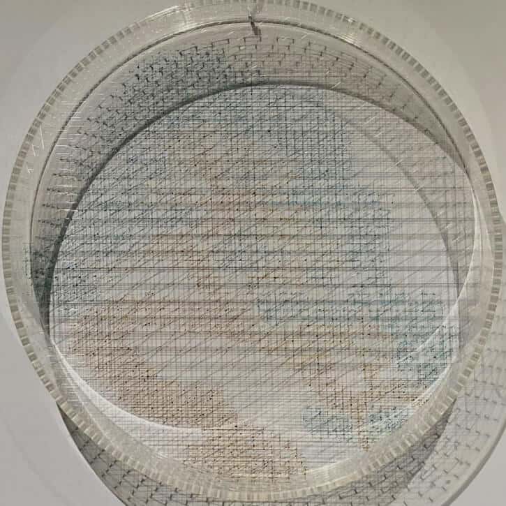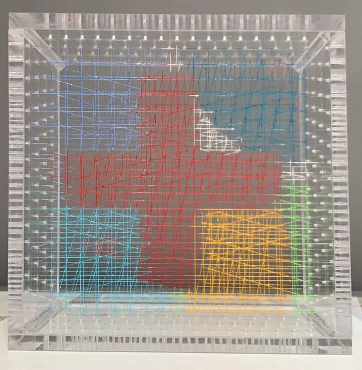 〈靜靜等待風的到來-1〉,透明壓克力、 透明 1.75 碳纖維線、透明免燒玻璃顏料,50 x 50 x 10 cm。圖 / 多納藝術提供。